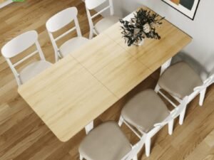 Lý do đến từ những tiện ích thông minh mà mẫu bàn ăn kéo dài thông minh này mang lại, với thiết kế tôi tân, chiếc bàn với bề mặt gỗ phủ màu vàng nhat, mix cùng màu với bộ chân trắng, hai gam màu này quả là một sự kết hợp tuyệt vời.