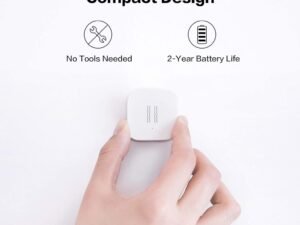 Sản phẩm sử dụng kết nối không dây Zigbee, cho phép việc lắp đặt và sử dụng vô cùng đơn giản. Với thiết kế nhỏ gọn (36 x 36 x 9mm). Cùng với miếng dán ở mặt lưng, nên chúng ta có thể lắp đặt ở bất cứ đâu bạn thích từ cửa sổ, cửa chính, ngăn kéo đến bình hoa.