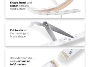Philips Hue Lightstrip là dòng đèn trang trí cao cấp dành cho các căn nhà thông minh. Với thiết kế từ nhựa dẻo phủ lên các bóng đèn LED 16 triệu màu. Phía sau là mặt keo giúp bạn tháo lắp dễ dàng tạo mọi vị trí trong căn nhà. Đèn LED dây Philips Hue mang một phong cách chiếu sáng mới trong chiếu sáng trang trí và chiếu sáng hắt trần. Không giống như các loại đèn huỳnh quang hắt trần. Dải đèn LED dây Philips Hue Lightstrip linh hoạt có thể uốn cong quanh các góc, cắt và kết nối theo chiều dài mong muốn.